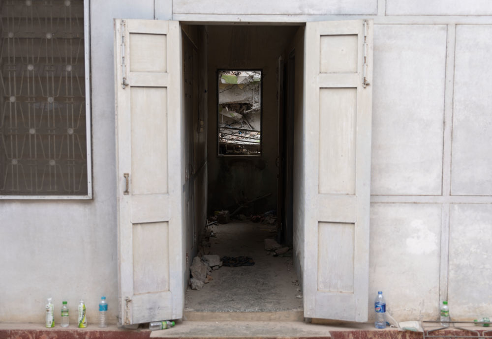 这是透过一个走廊拍摄的欣欣家所在楼坍塌的情形。