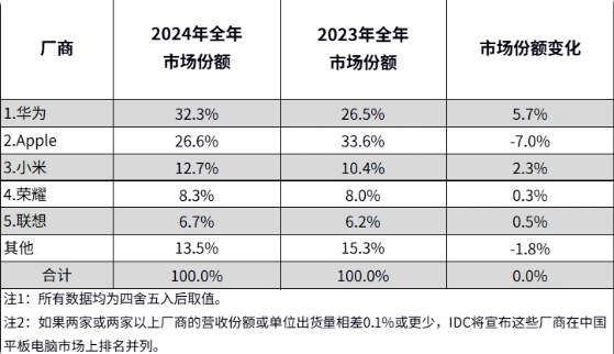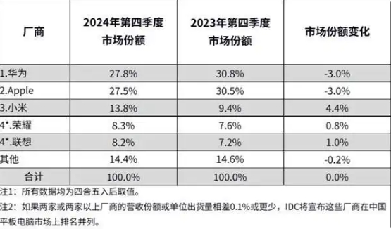 根据国际数据公司(IDC)发布的2024年第四季度中国平板电脑市场季度跟踪报告,2024年全年中国平板电脑市场出货量为2985万台,同比增长4.3%。在这一年里,华为成为了最大赢家,其2024全年和第四季度的市场份额均排名第一。