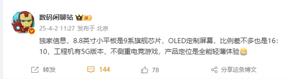 【CNMO科技消息】4月2日,有数码博主曝光了一款8.8英寸的小平板,搭载9系旗舰芯片,配备了定制OLED屏幕,屏幕比例接近16:10,工程机还有5G版本。它并不侧重于电竞游戏,产品定位是提供全能且轻薄的体验。尽管博主没有明确指出这是哪家公司的产品,但结合此前的消息和网友的猜测,大家普遍认为这很可能是华为的新品。