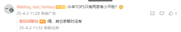 在评论区,有网友询问,今年TOP5厂商中是不是只有两家有小平板产品,博主给予了肯定答复,表示其他厂商暂时没有相关计划。据CNMO了解,除了华为,另外一家有小平板的厂商应该是小米。关于发布时间,这款华为8.8英寸小平板大概率会在二季度推出。