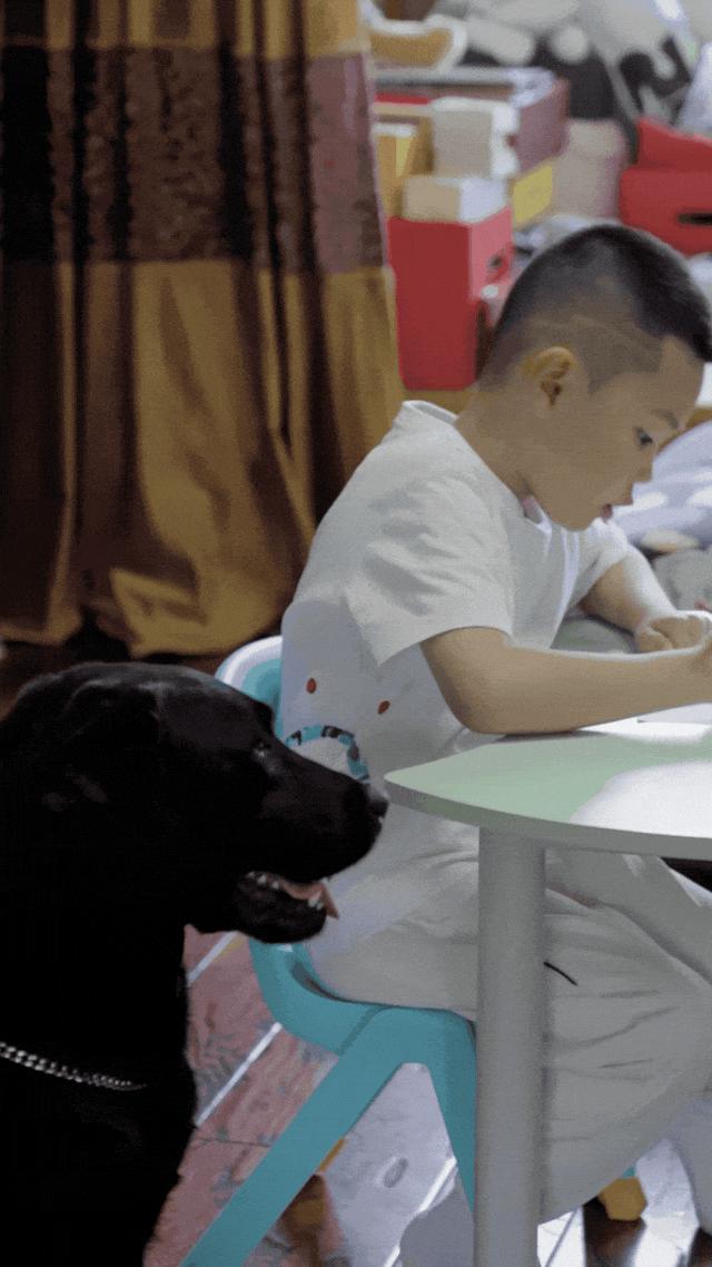 现在Eric学习的时候,哈雷就在旁边陪着他。孤独症孩子很容易走神,因为狗狗一直待着,他会感到被守护,注意力更集中。