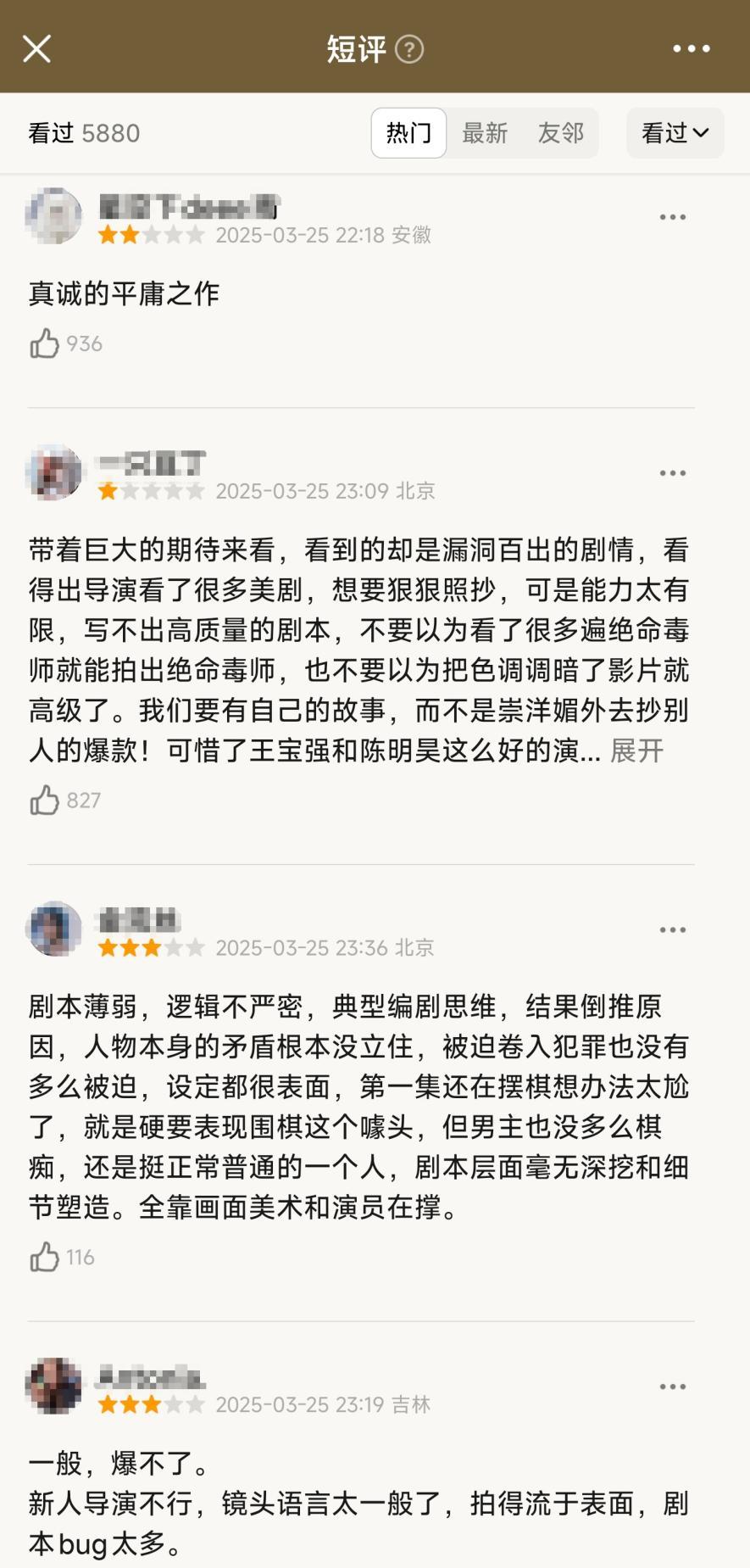 这种失焦,不仅造成了《棋士》在主题与类型上的游移不定,也明显破坏了剧集质感。这也导致,除了主演王宝强的演技和制作,诸如剧情走向、叙事节奏、人物逻辑等方面都饱受诟病。