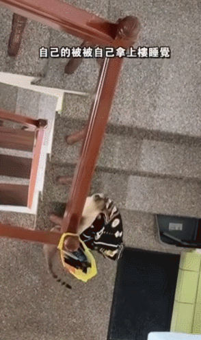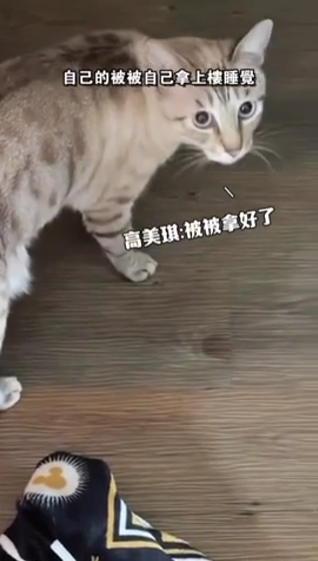 而小猫也十分依赖高女士,常常叼着自己的小棉被爬上楼梯去找高女士。