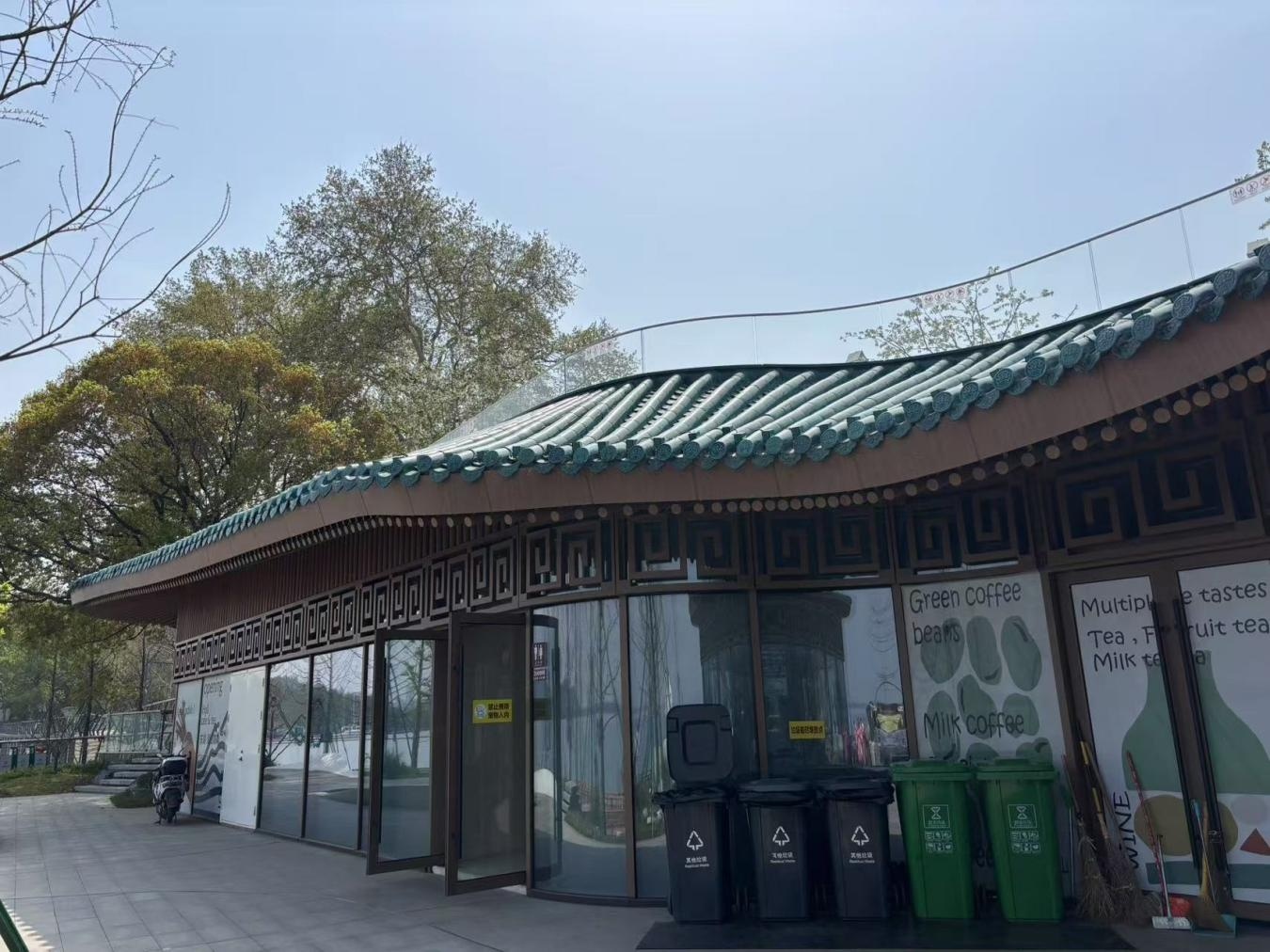 顺着凌波门往里走约200米,就来到了平湖珞樱平台。这是一处依湖而建的下沉式综合体,有便利店、餐厅、咖啡馆,还设有开放式座位和移动充电设施,可休闲可观景。