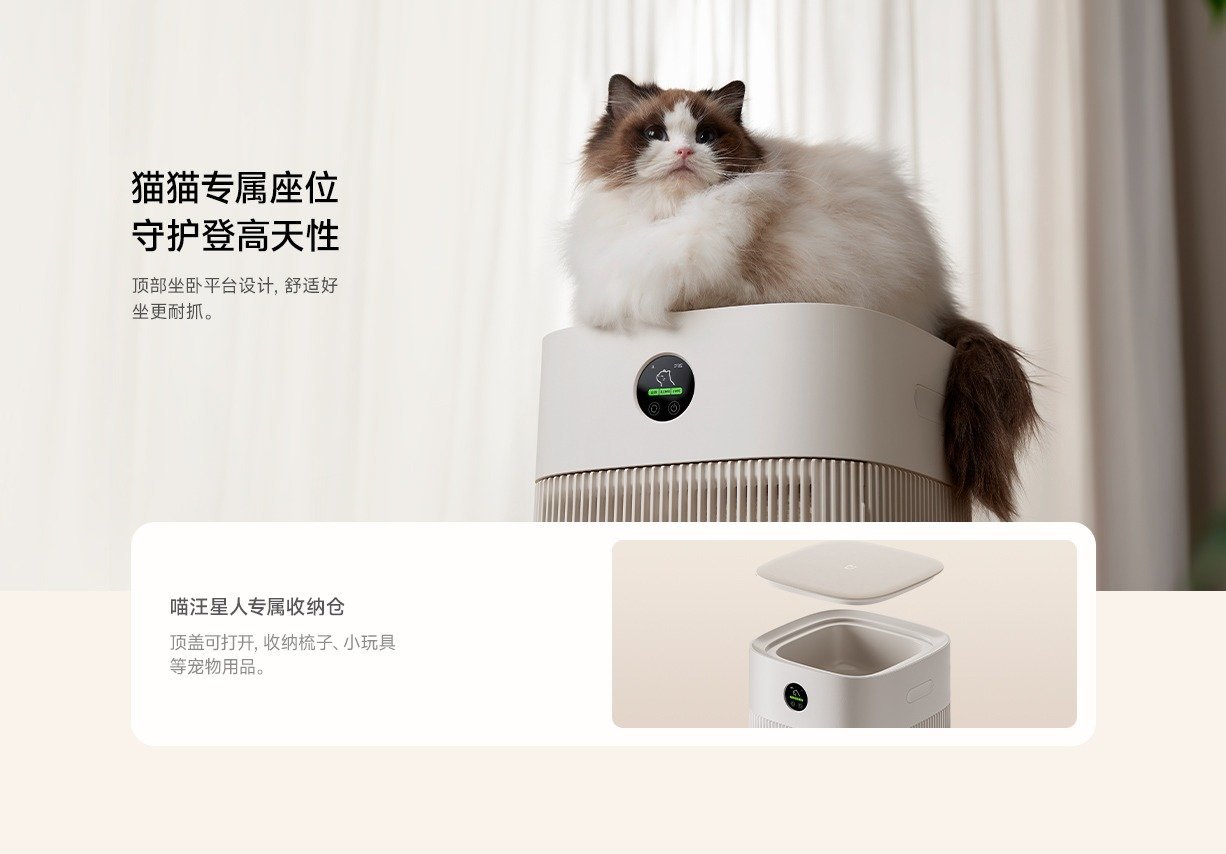 在外观上,米家宠物空气净化器还做了很多针对宠物的设计,比如采用防咬型的电源线和护宠式格栅,在倾倒的时候还可以自动断电。在机身顶部,它还准备了一个坐卧平台,号称“猫猫专属座位”,其下还有一个收纳仓。