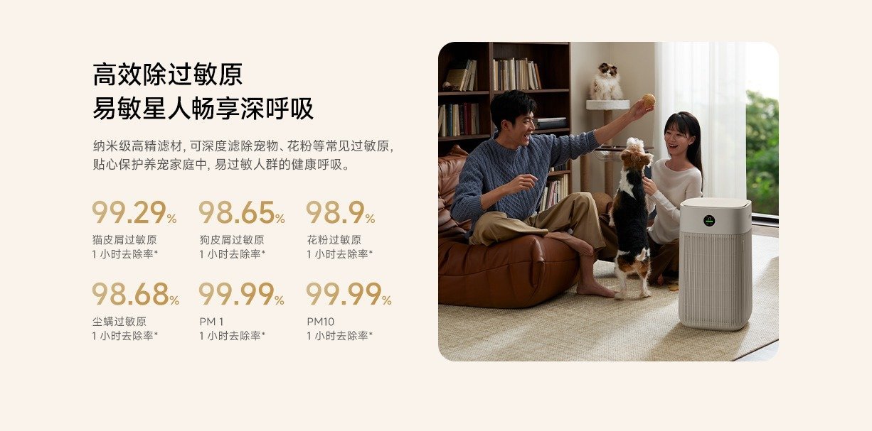 这款空气净化器采用了创新聚能风道,对毛发皮屑的收集能力更强,颗粒度 CADR 可以达到 489m³/h,并且据称可以高效除过敏原。