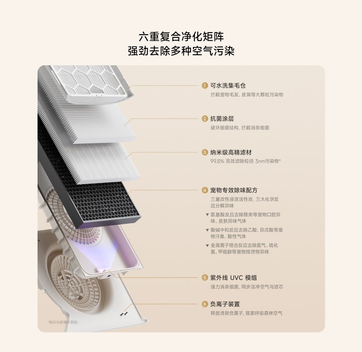 米家宠物空气净化器搭载了六重复合净化矩阵,其中活性炭的部分采用了宠物专效除味配方,可以去除各种异味,另外还有紫外线 UVC 、负离子装置和抗菌涂层,最外层还是可水洗的集毛仓设计,循环使用免更换,可以延长滤芯的寿命。它内置了五大高精传感器,可以监测 PM 1、PM2.5、粉尘、温度和湿度。