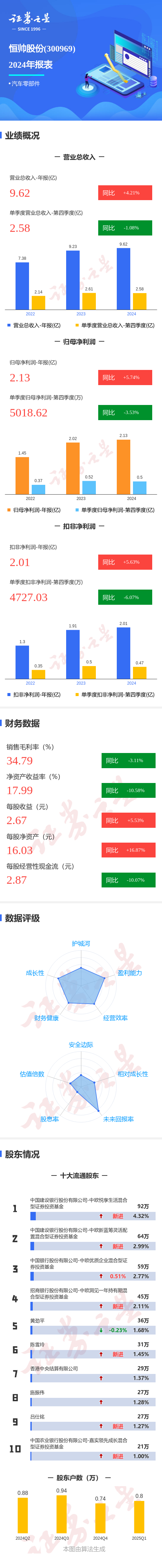 证券之星消息,恒帅股份2024年年报显示,公司主营收入9.62亿元,同比上升4.21%;归母净利润2.14亿元,同比上升5.75%;扣非净利润2.02亿元,同比上升5.63%;其中2024年第四季度,公司单季度主营收入2.58亿元,同比下降1.08%;单季度归母净利润5018.62万元,同比下降3.53%;单季度扣非净利润4727.04万元,同比下降6.07%;负债率18.57%,投资收益501.06万元,财务费用-1558.37万元,毛利率34.79%。