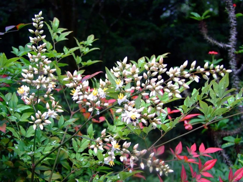 南天竹也是可以开花结果的,特别是养在阳光较多的地方,它就会在夏秋季节开出白色的花朵,冬春时节就会有红彤彤的小果实,看着诱人,但也都是有毒的。