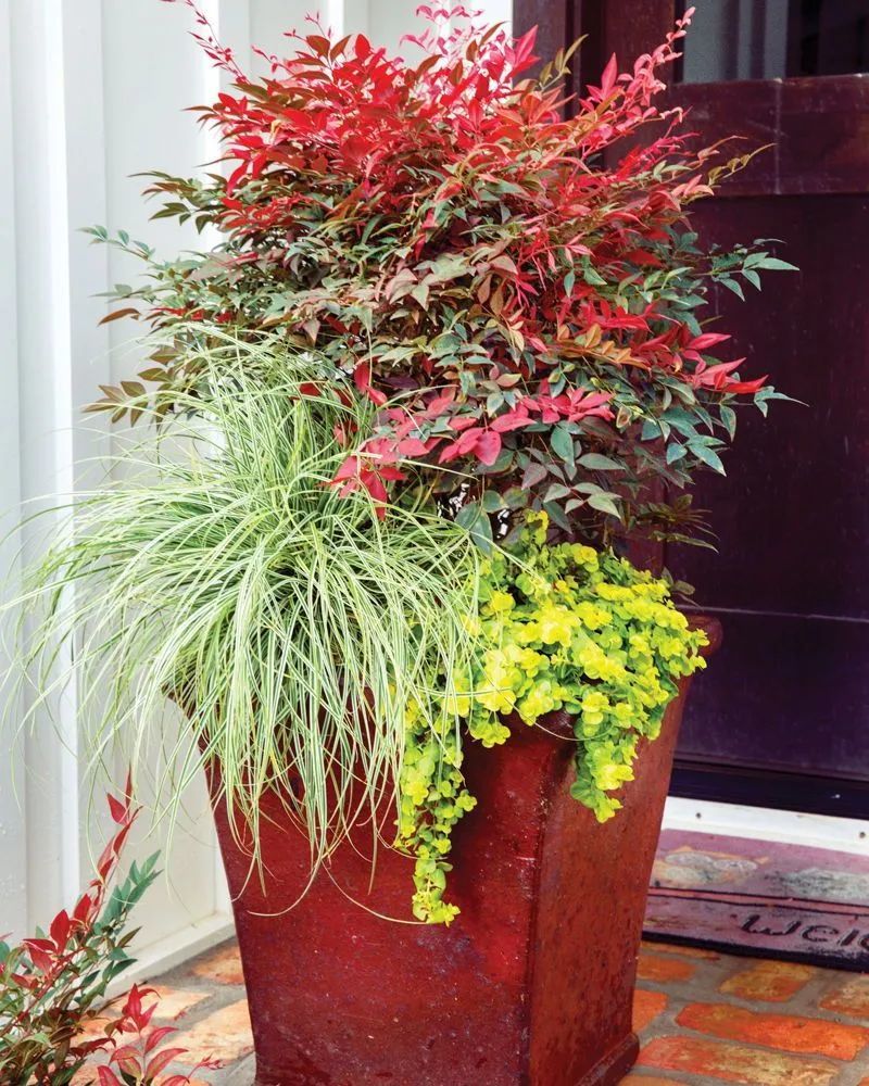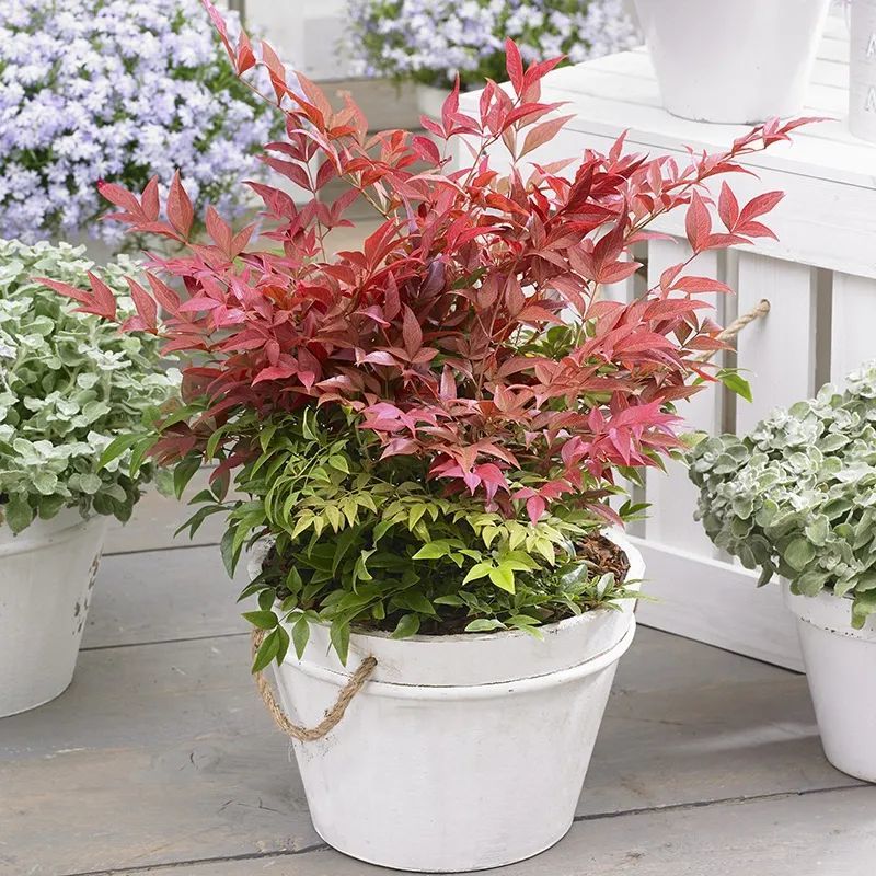 现在也出现一些园艺观赏品种,包括常见的火焰南天竹,它就比较适合养成院子,或养成阳台上的盆栽,将它和其他的植物组合起来栽种,观赏性就会不断提高,在花盆边缘处,可以布置一些金叶过路黄等观赏植物,就变成了很不错的组合盆栽。
