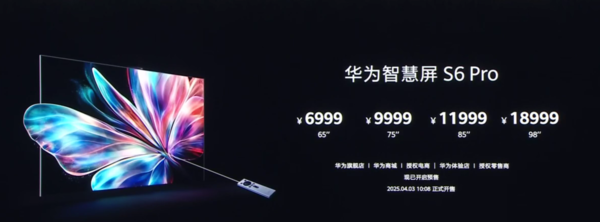 【CNMO科技消息】3月20日,华为举办了Pura先锋盛典及鸿蒙智行新品发布会,会上推出了年度旗舰智慧屏产品——华为智慧屏 S6 Pro。4月3日10点08分,华为智慧屏 S6 Pro正式开售,提供四个尺寸选择,售价6999元起。