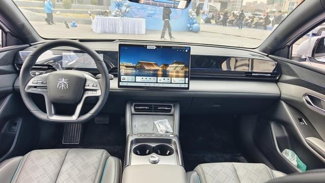 座舱内部是熟悉的风格,12英寸W-HUD抬头显示,8.8英寸全液晶仪表和15.6英寸悬浮式中控大屏满满的科技感。配置是比亚迪的拿手好戏,除了常规的50W无线充、车载ETC、行车记录仪、全景影像、手机NFC车钥匙等功能外,秦L EV还提供同级唯一的一体式智能冷暖冰箱,电子怀挡操作起来也更加方便。