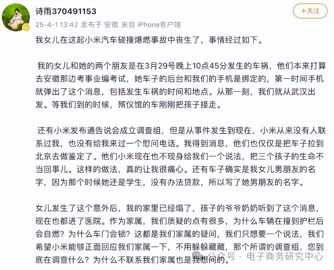雷军在4月1日晚的发文中表示,事故让他“心情非常沉重”,并对遇难者家属致以深切慰问。他强调,小米不会回避问题,已成立专项小组赶赴现场,并配合警方提交了车辆数据。但由于事故仍在调查中,小米尚未接触到事故车辆,因此许多问题暂时无法给出确切答案。