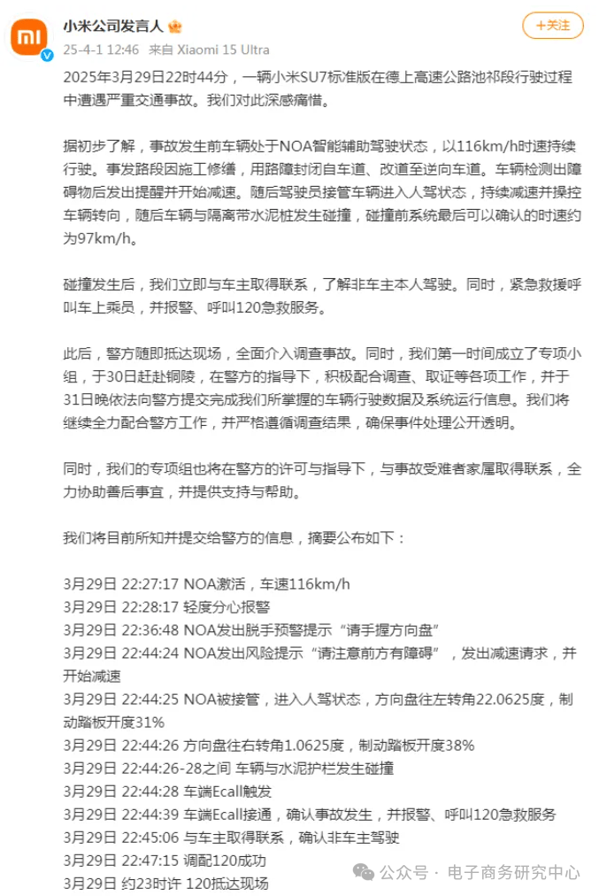 2. 透明化处理:小米表示已向警方提交车辆数据,并将持续跟进调查进展。