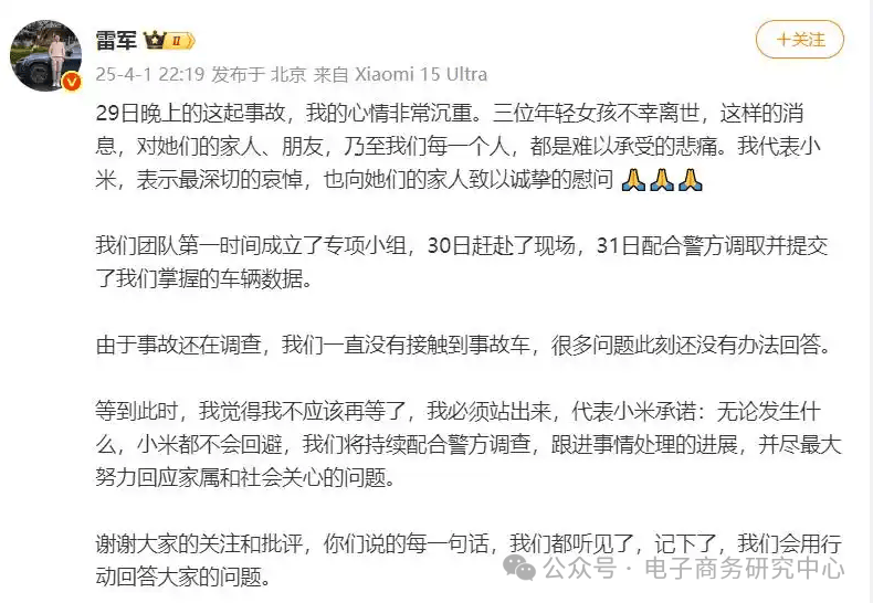 1. 主动承担责任:尽管事故原因尚未明确,但雷军并未推卸责任,而是承诺“无论发生什么,小米都不会回避”。