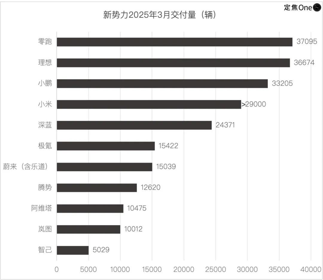 零跑3月交付量同比涨了1.5倍,和小鹏的差距进一步缩小,不过最终季度交付8.8万辆,排名第三。
