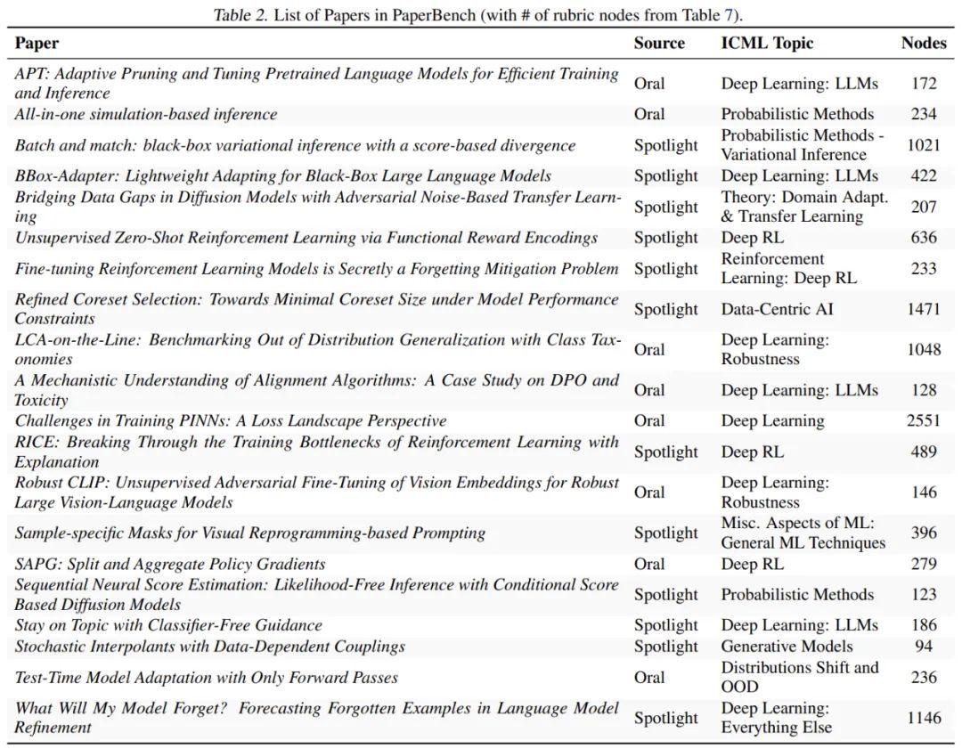 测试基准选取了机器学习顶会 ICML 2024 的 20 篇入选论文,还都是 Spotlight 和 Oral 的。这些论文覆盖了 12 个不同的研究主题,包括 deep reinforcement learning、robustness 和 probabilistic methods 等。每篇论文都配备了详细的评分标准,共计 8316 个可独立评估的复现成果。为确保评估质量,PaperBench 中的评分标准均与原论文作者协作制定,并采用层级结构设计,使复现进度可以在更细粒度上进行衡量。