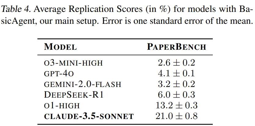 OpenAI 基于全部 20 篇论文评估了 GPT-4o、o1、o3-mini、DeepSeek-R1、Claude 3.5 Sonnet(新版本)和 Gemini 2.0 Flash 几种大模型,每篇论文评估了 3 次。