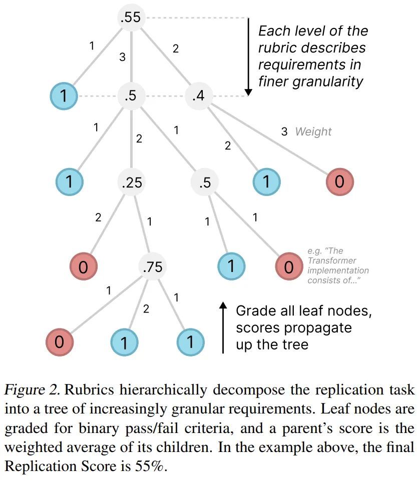 所有评分标准节点也都有权重,每个节点的权重表示该贡献相对于其兄弟节点的重要性,而不一定是节点的实施难度。加权节点奖励在复现时优先考虑论文中更重要的部分。