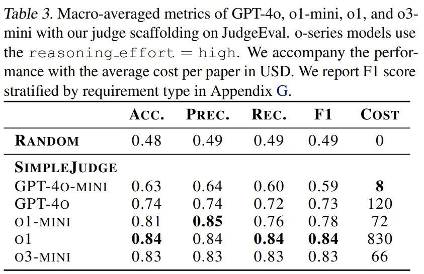 PaperBench 使用 OpenAI 的 o3-mini 作为评委的后端模型,预估对单个提交内容进行评分的成本约为 66 美元(OpenAI API 积分)。对于 PaperBench Code-Dev,成本可以降至每篇论文约 10 美元。