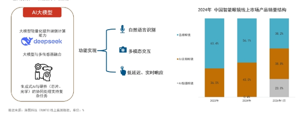 在AI大模型的快速发展影响下,智能眼镜领域迎来了关键进步。2023年初,AI大模型横空出世,智能音频眼镜率先集成AI大模型,AI技术赋予的更智能的语音交互、个性化推荐、实时信息处理等功能,使其逐渐从简单语音助手向实现多模态交互的智能助理转变。2024年,全球智能眼镜市场(不含AR)的出货量为156.8万副,同比2023年增长119%。