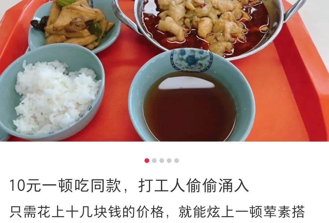 这也有了大学生跑去工地抢盒饭吃,现在还流行起了一个新趋势:打工人跑到国企花个10多块钱就能吃到局长同款。