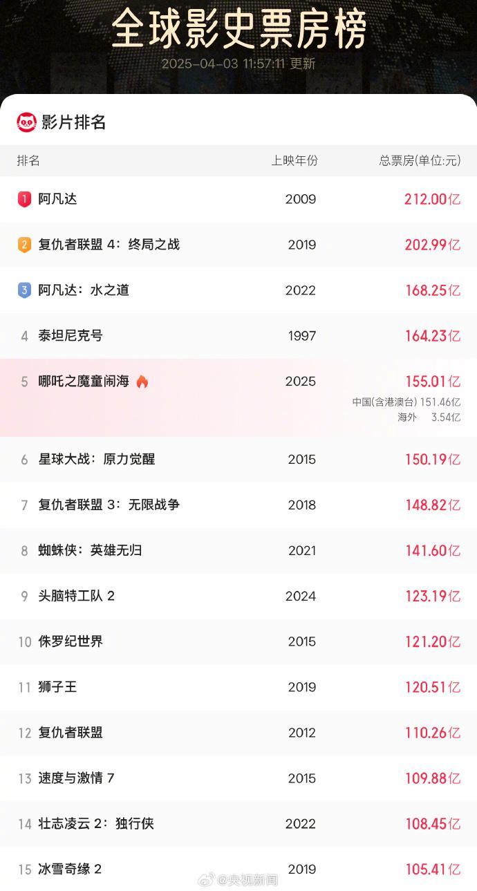 ZAKER娱乐4月3日消息 据网络平台数据,《哪吒之魔童闹海》全球票房(含预售及海外)已超155亿。