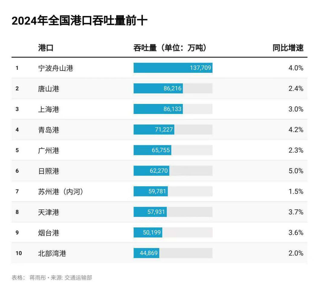 根据交通运输部统计,2024年全国港口货物吞吐量前十名分别为:宁波舟山港、唐山港、上海港、青岛港、广州港、日照港、苏州港、天津港、烟台港、北部湾港。
