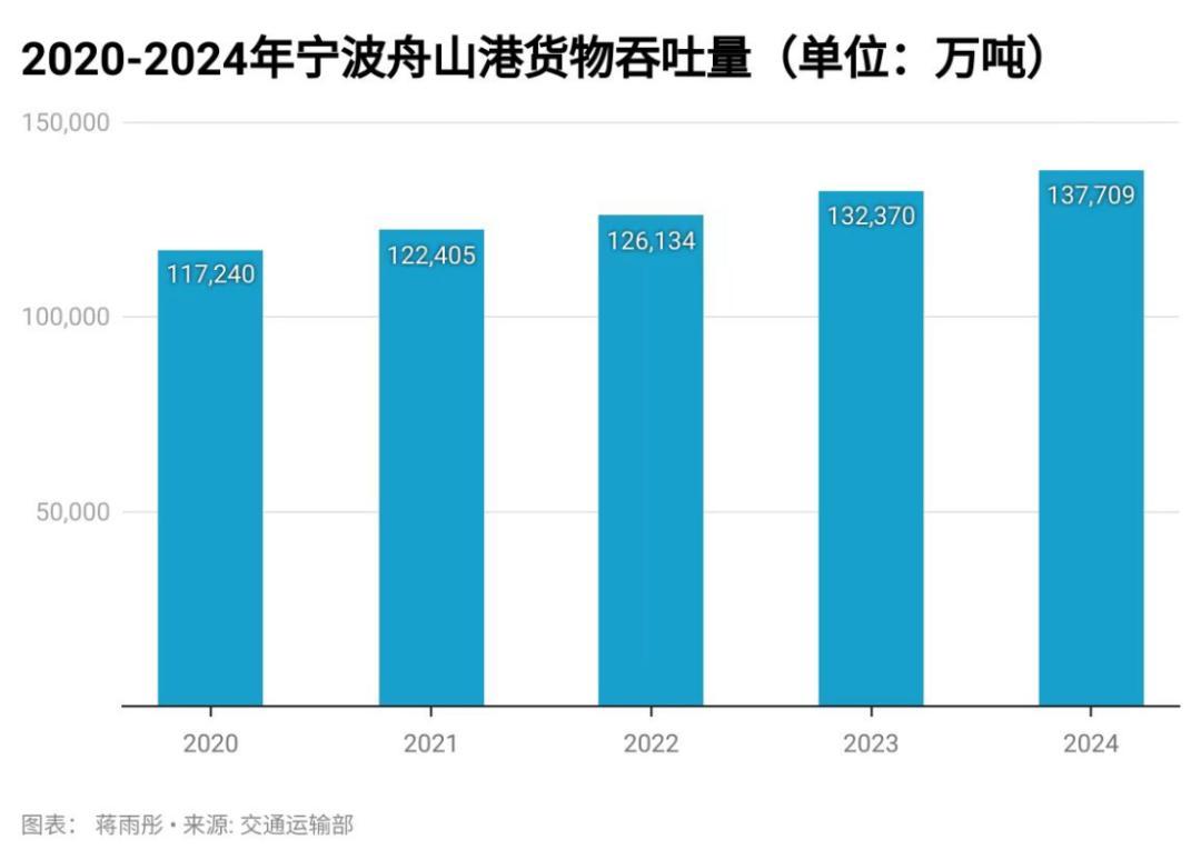 宁波海关的数据显示,宁波舟山港2024年共完成货物吞吐量超过13.77亿吨,同比增长4%,创历史新高,居世界第一;其中,完成集装箱吞吐量3930万标准箱,同比增长11.3%,居全国第二。