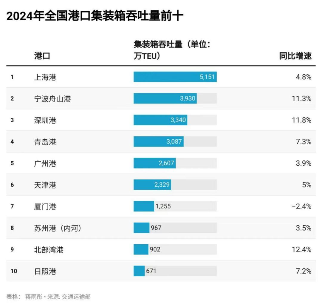 长三角双雄地位稳固:2024年,宁波舟山港以13.77亿吨的吞吐量(同比增长4%),蝉联世界第一;上海港的集装箱吞吐量第一次突破5000万标箱,巩固航运中心的位置。