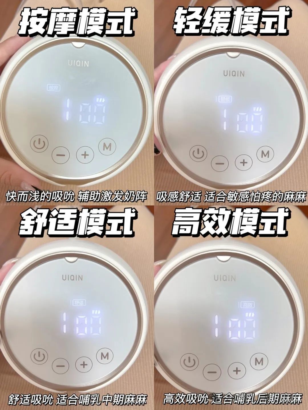 还有,现在的高端吸奶器,还有按摩效果,能帮助更好地刺激乳汁的分泌。闺蜜用的UIQIN羽轻电动吸奶器,不仅有多频率泌乳模式,还有按摩效果,难怪她会觉得,用吸奶器吸奶,感觉乳汁更多一些。