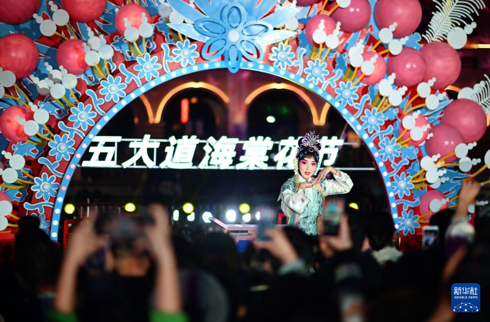 4月3日,人们在第三届五大道海棠花节启幕现场观看戏曲表演。