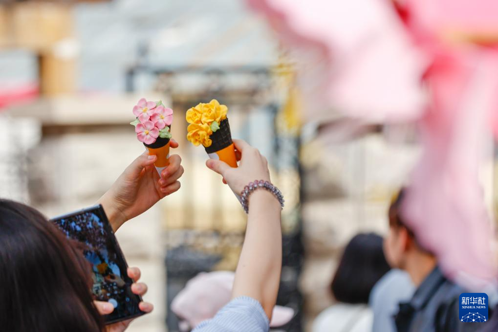 4月4日,在天津市五大道风景区,游客手举海棠花造型雪糕拍照留影。