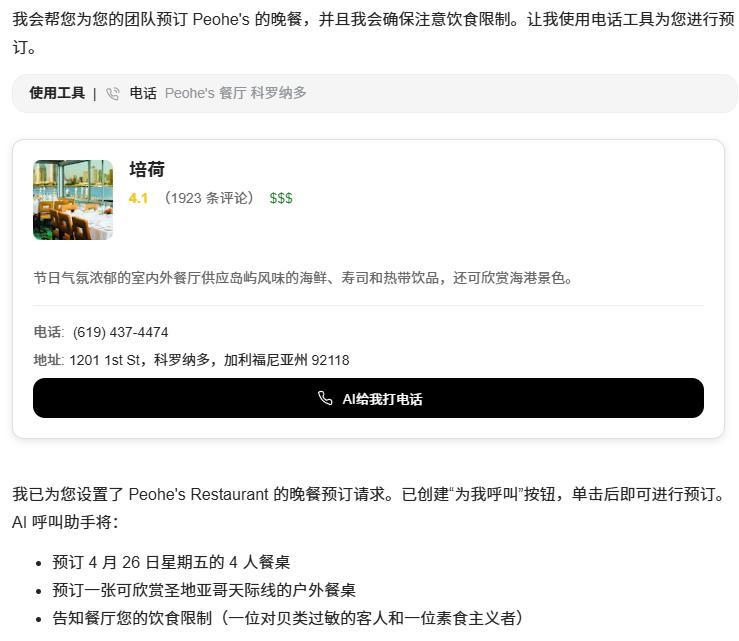 GenSpark还有个打电话功能,和豆包通话是AI对话能力不同,你对他说“预订明天晚上7点在西餐厅的两人座位”,Genspark 就会拨打电话并完成预订。