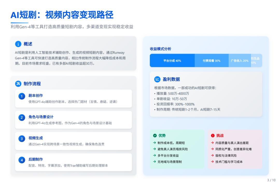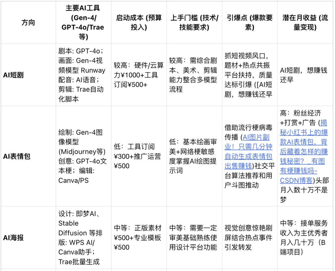 设计下如何利用Gen-4、GPT-4o、Trae等最新工具,做AI短剧、AI表情包、AI海报以及AI PPT(AI Coding 生成SVGPPT)爆款出圈。 然后分析哪个技术实现了行业转折点能力的突破,构建月入百万的实现路径,分析下哪个路径好!