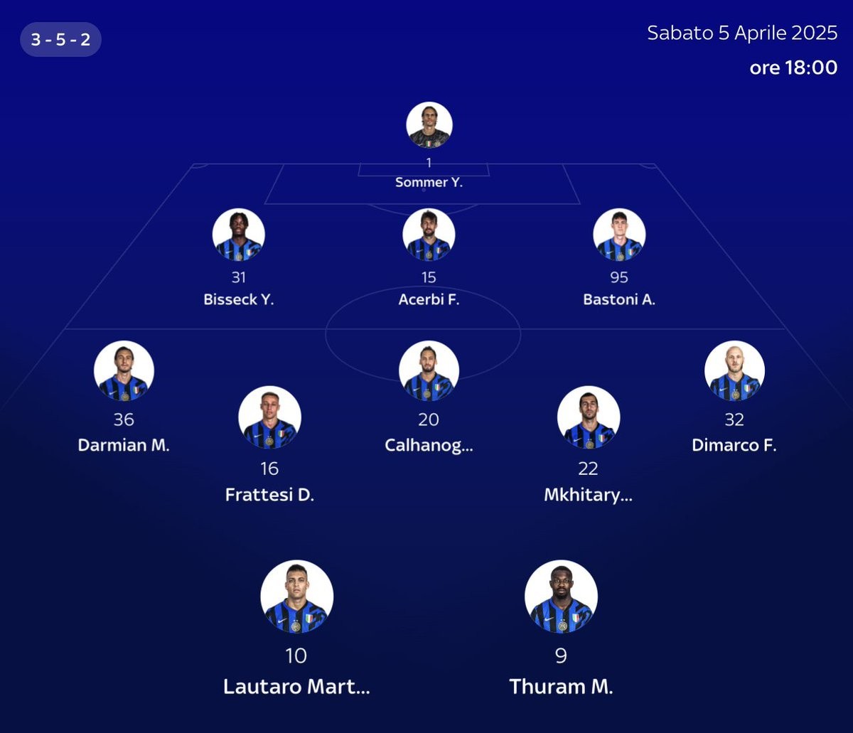 意大利天空体育的报道认为,本场比赛劳塔罗将会以首发的身份复出,与马库斯-图拉姆搭档锋线,弗拉泰西、恰尔汗奥卢、比塞克也将继续出战,迪马尔科、阿切尔比、索默重返首发阵容。