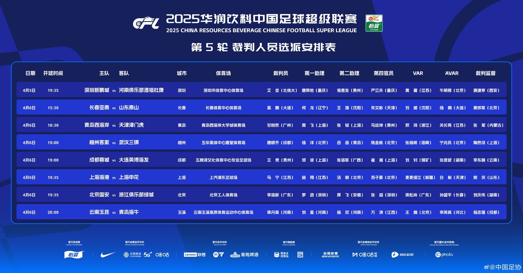 北京时间4月5日,中超第5轮裁判安排出炉。马宁执法上海德比,李海新吹国安vs浙江。