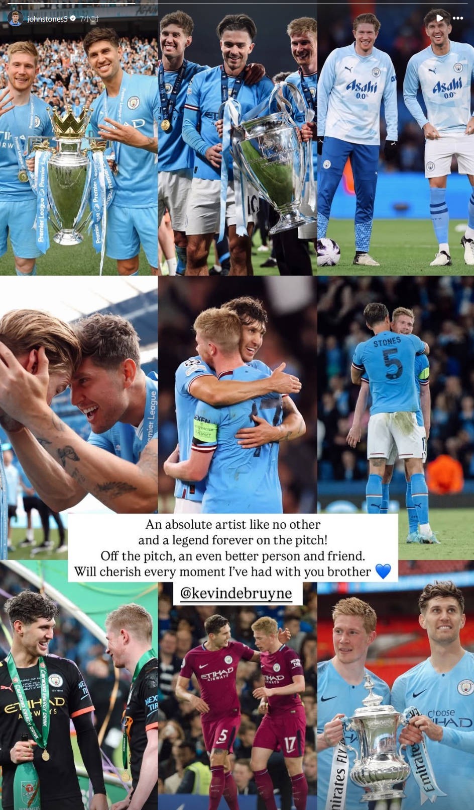 斯通斯晒出了自己与德布劳内的合照,并配文:“一位无与伦比的艺术家,球场上永远的传奇!球场外,一个更好的人,一个更好的朋友,我会珍惜与你拥有过的所有瞬间。”