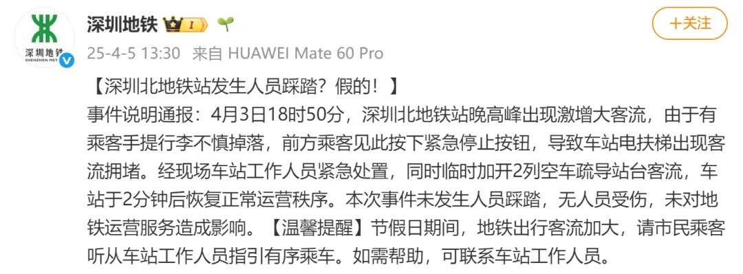 4月5日13时30分,“深圳地铁”官博发文辟谣“深圳北站地铁站发生踩踏”,通报事件经过。