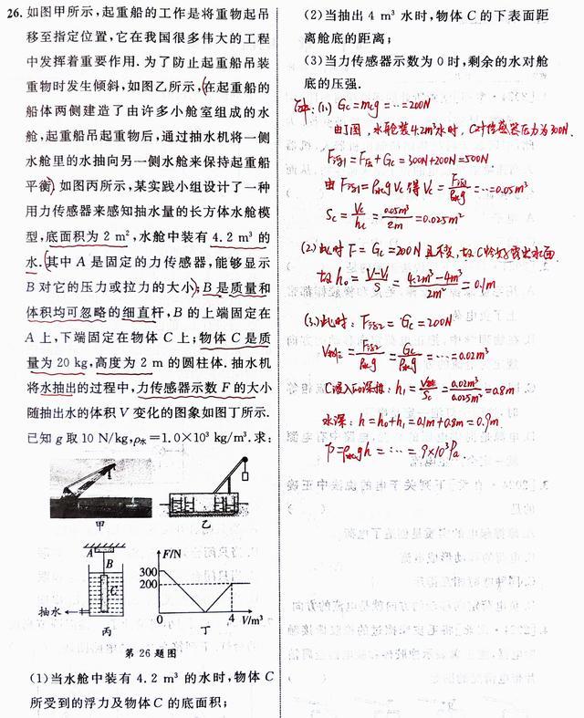 第二问:抽水4m³后,物体C下表面距离舱底的高度。此时传感器读数变为200N,说明浮力刚好等于物体C的重力,物体C处于悬浮状态。此时剩余水量为0.2m³,水舱水位高度可通过底面积计算。但需注意:物体C是否还浸在水中?从浮力与重力的平衡关系可知,物体C必须部分浸入水中,因此其下表面距离舱底的高度为水位高度减去浸入深度。