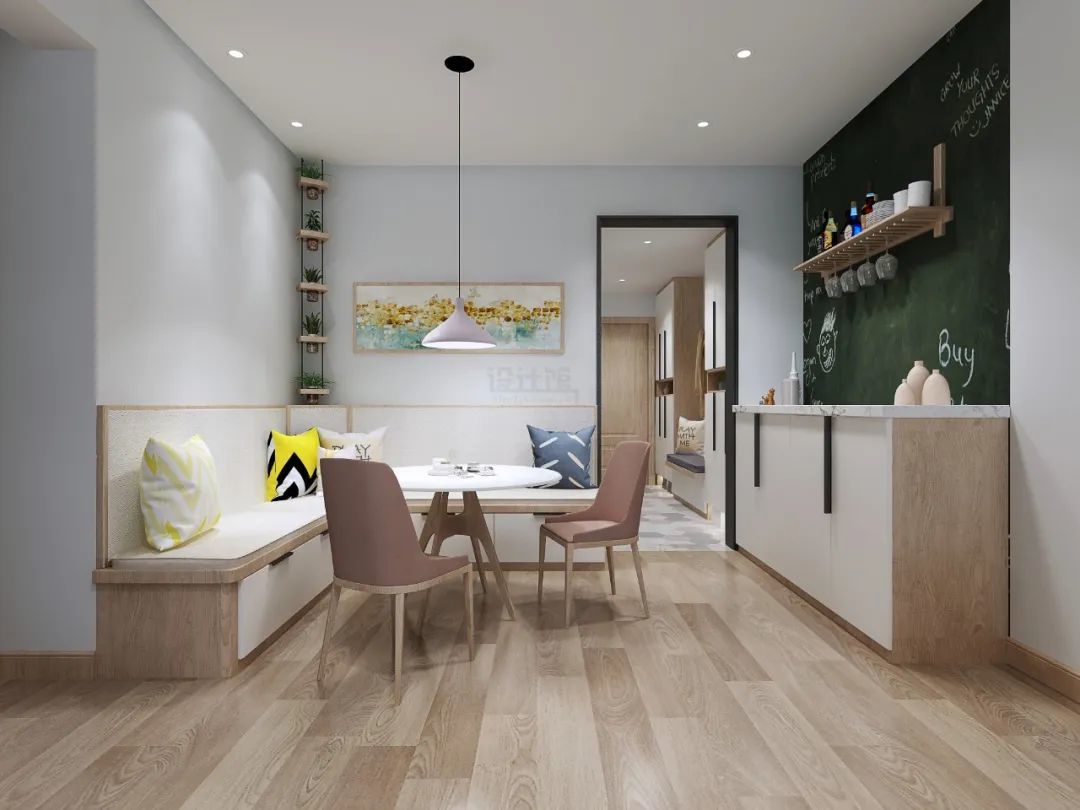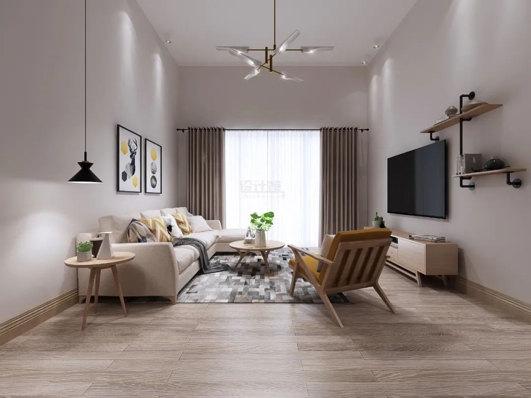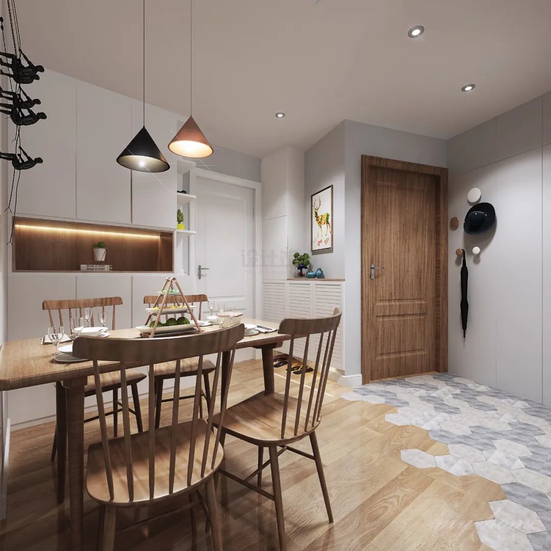 由于北欧风的装修需要营造温馨自然的空间感,一般瓷砖的质感过于冰冷;因此在北欧风格中,除了卧室地面会铺木地板,一般连客餐厅的地面也是统一铺木地板的,这样才能让空间显得自然温馨而舒适。