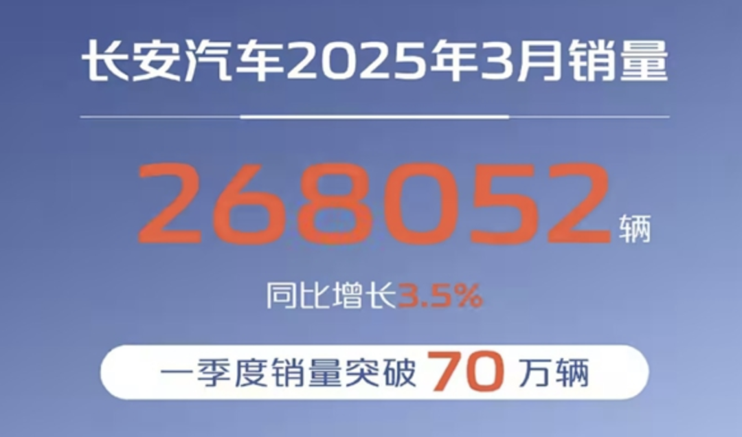 长安汽车公布 2025 年 3 月销量为 268052 辆,同比增长 3.5%,一季度销量突破 70 万辆。