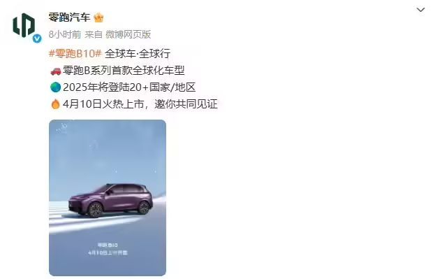 零跑汽车今日官宣,零跑 B10 将于 4 月 10 日上市,这是零跑 B 系列首款全球化车型,2025 年将登陆 20 + 国家 / 地区。