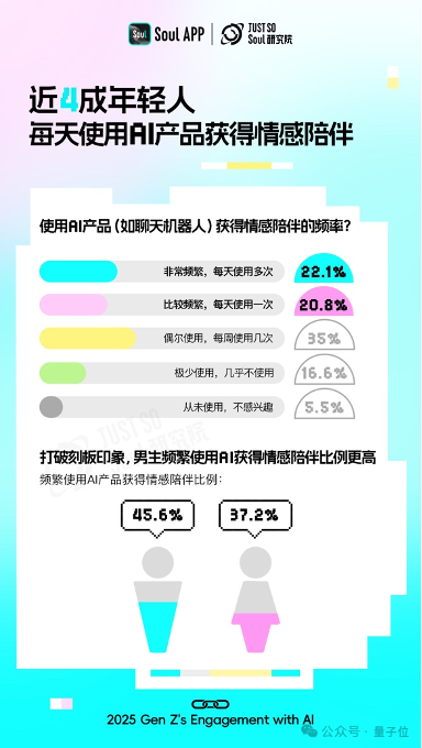 特别是和传统观念中“女性更需要AI获得情感陪伴”的认知不同,数据显示,男生频繁使用AI获得情感陪伴比例更高,两者比例分别为45.6%(男)和37.2%(女)。