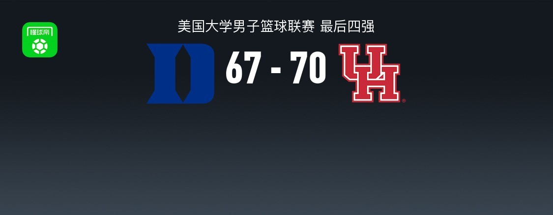 北京时间4月6日美国大学男子篮球联赛 最后四强,杜克大学对阵休斯敦大学。半场杜克大学34-28休斯敦大学,最终杜克大学67-70休斯敦大学。杜克大学库珀·弗拉格27分7板4助,康·克努佩尔16分7板2助;休斯敦大学奎尔26分5板1助,伊曼纽尔·夏普16分3板。