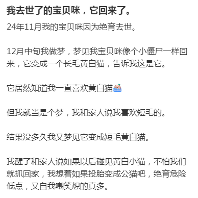 没想到12月她梦到,咪像个小僵尸一样回来了,还变成了一只长毛黄白猫。