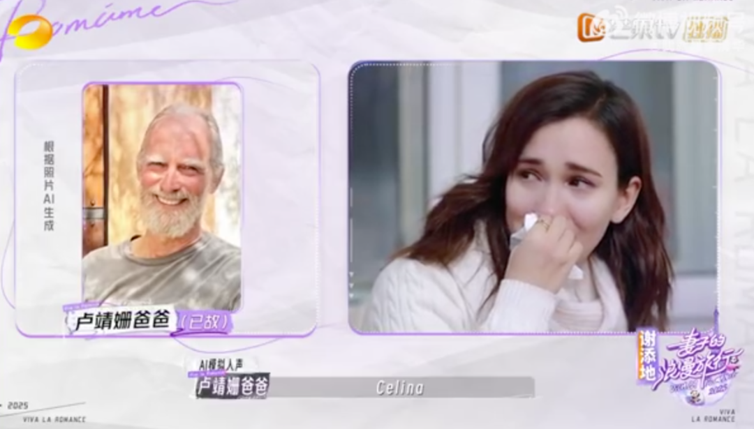 在《妻子的浪漫旅行》里,韩庚为妻子卢靖姗准备了一段由 AI 生成的已故父亲的寄语视频|图片来源:芒果 TV