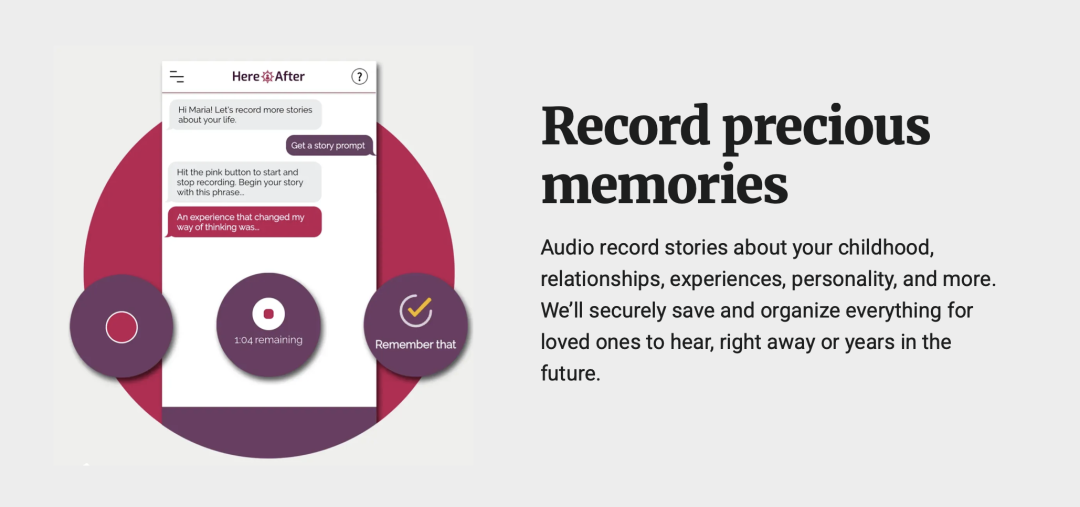 诞生自 2023 年,口号是「你的故事和声音将永存」的 HereAfter AI 另辟蹊径,不走「重生流」,而是让用户先录下自己的声音和人生故事,比如童年回忆、人生经历、家族历史等,HereAfter AI 会整理这些录音并生成一个 AI 互动版本,可以作为数字遗产留给后人。它更像一个「生前存档」,而非赛博复生。