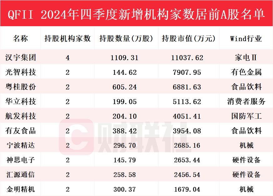 从最新持仓动向来看,Wind数据显示,QFII 2024年四季度新进入95家个股的前十大流通股东名单。其中,汉宇集团获QFII持股新增机构家数最多,达4家。此外,光智科技、粤桂股份、华立科技、航发科技、有友食品、宁波精达、神思电子、汇源通信和金明精机新增QFII持股家数均达到2家。具体情况如下图: