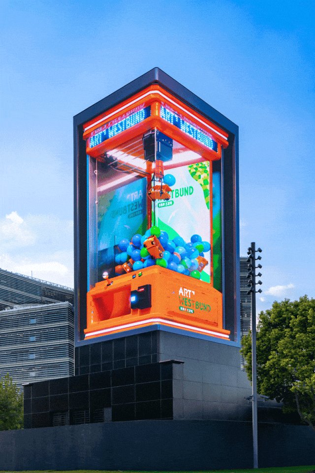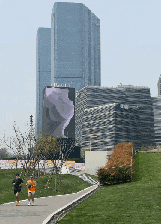 上午10点多,徐汇滨江已经十分热闹,油罐艺术中心附近,抬头就能看到黄浦江边唯一的大型户外裸眼3D动态机械屏幕,时而如同古早的像素游戏,时而展示前卫的艺术创作……